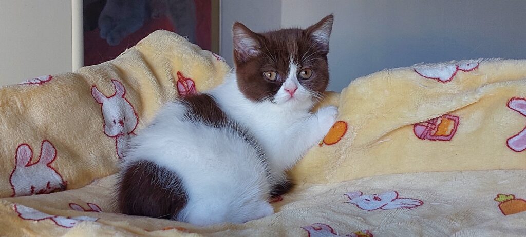 AGATHE femelle British Shorthair chocolat et blanc harlequin (DISPONIBLE)